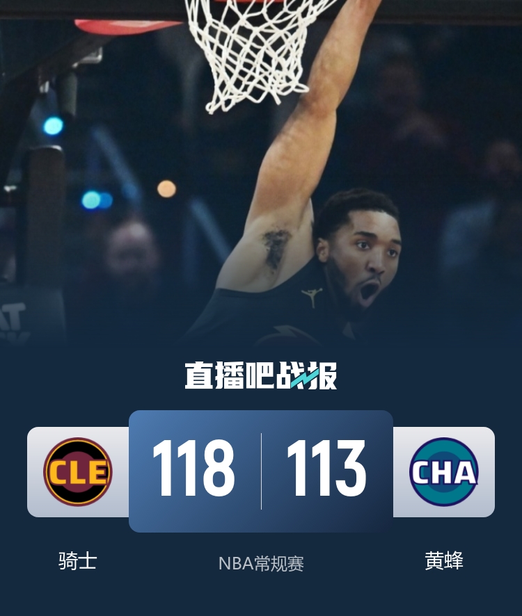 一开场,阿伦继续高效输出,黄蜂外线开火连中三分强势回应,米切尔连投带罚率队获得两位数优势,克尼佩尔内外开花帮助球队迫近比分,哈登连送4次助攻,骑士打出10-2的攻击波扩大优势,黄蜂3记三分还以颜色,半场战罢骑士59-53领先黄蜂。下半场,克尼佩尔延续火力,黄蜂外线神准连中三分强势反超,哈登和米切尔联手带队给出回应,末节哈登得分助攻一肩挑带队占据主动,迪恩·韦德2记三分稳住局势,黄蜂苦苦追赶无果。最终,骑士118-113力克黄蜂,豪取7连胜。