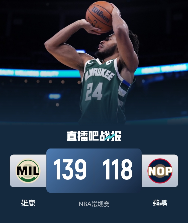 比赛上来,两队就打得很胶着,场上多次出现平分,不过雄鹿利用一波7-0的小高潮稍稍取得场上领先,但鹈鹕随后就用一波14-2的攻势完成反超,次节双方一直保持拉锯,但节末鹈鹕落入下风,而雄鹿继续狂轰单节再拿38分,半场结束时鹈鹕落后6分;下半场回来,鹈鹕虽然一直紧咬比分,分差最小时仅剩2分,却始终无法完成反超,末节雄鹿的双向合同球员南斯突然爆发,他连中三分球一个人将分差拉开到两位数,鹈鹕也没有反抗之力,最终雄鹿轻取鹈鹕迎来三连胜。