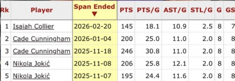 据The Lead统计,科利尔近八场场均18.1分10.9助攻2.5抢断。而本赛季能做到连续8场比赛有场均至少18分10助攻2抢断数据的球员仅3人。