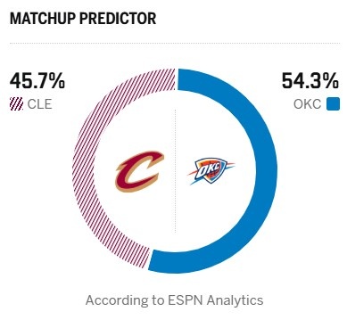 ESPN更新了本场比赛胜率预测,其中客场作战的骑士胜率为45.7%,雷霆胜率为54.3%。