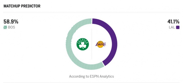 直播吧2月22日讯 湖人明天主场迎战凯尔特人,ESPN发布本场胜率预测。