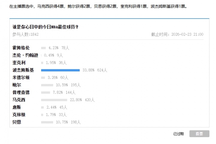 评选规则:候选球员由每场主播提名,吧友投票占比70%,主播投票占比30%,综合占比最高者当选今日最佳。