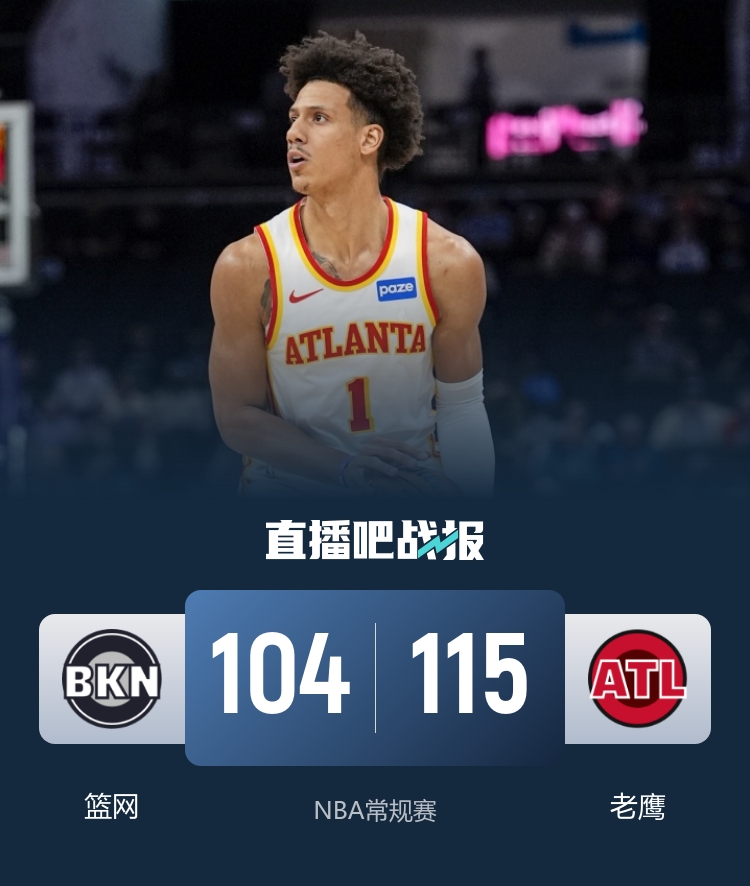 比赛上来,两队就打得很胶着,老鹰虽然有拉开分差的势头,但篮网总能及时给出回应咬住比分,次节老鹰继续获得建立优势的机会,分差最大达到8分,不过他们仍没能把握住机会,篮网一波13-0的小高潮直接完成反超,凭借着麦科勒姆的连续得分,半场结束时老鹰勉强领先4分;下半场回来,双方继续纠缠,场上比分交替领先,末节老鹰突然断电,他们先让篮网连拿8分拉开分差,自己则在前四分钟的时间里只拿到2分,曼恩的三分球直接将分差拉开到两位数,但最后时刻老鹰在杰伦·约翰逊的带领下一波24-2直接反超并带走比赛,最终老鹰力克篮网,送给后者四连败。