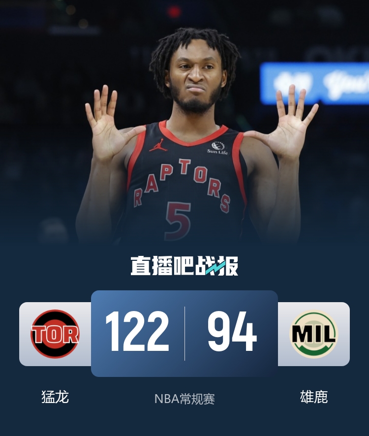 比赛开始,双方上来节奏很快但命中率一般,连续外线尝试都是各种打铁,托马斯上场后连续得分帮助雄鹿占据主动权,首节雄鹿领先5分,次节奎克利站出来里突外投连续追分,猛龙外线打开手感直接反超,随后奎克利里突外投继续取分,单节18分带领雄鹿反超9分。下半场,雄鹿8-2追分后猛龙迅速回应10-0,随后猛龙外线继续发炮扩大至20分以上领先,末节猛龙继续扩大领先,半节后双方逐渐换上替补练兵,最终猛龙122-94轻取雄鹿。