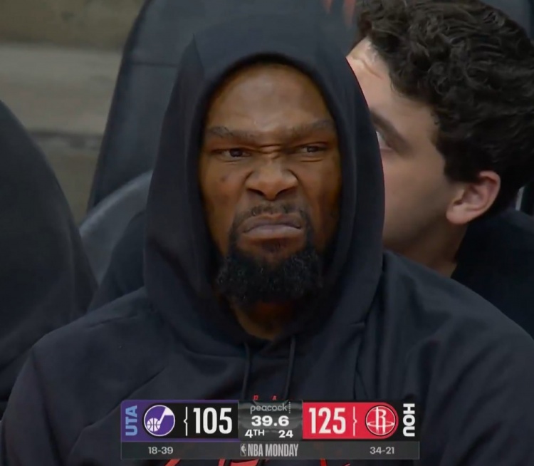 >霍勒迪极限三分!杜兰特板凳席上眉头紧锁&嘴唇紧抿