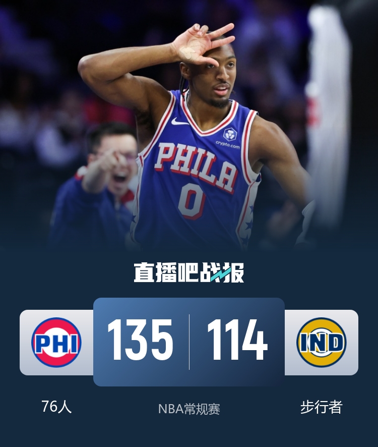 上半场,双方开场势均力敌,比分交替领先,步行者持续发力,内外开花逐渐占据场上主动,次节步行者突然哑火,76人轰出24-2的进攻狂潮确立两位数优势,马克西和恩比德联手高效拿分,米卡·波特成为奇兵里突外投带队追赶,半场战罢76人75-65领先步行者。下半场,76人牢牢占据场上主动,内外开花不断扩大领先,马克西两罚全中将分差拉开到20分以上,末节76人稳扎稳打保持大比分的领先,步行者大势已去无力回天。最终,76人135-114轻取步行者,客场过关。