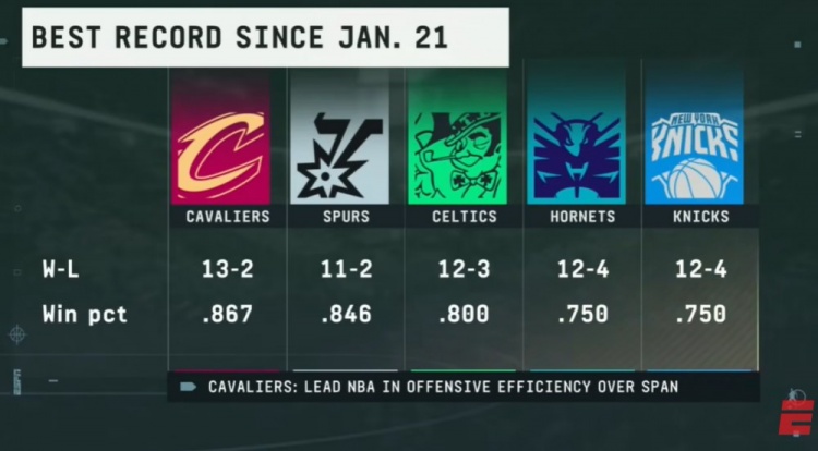 >1月21日以来最佳战绩:骑士居首 马刺居次 绿军黄蜂尼克斯分列3-5