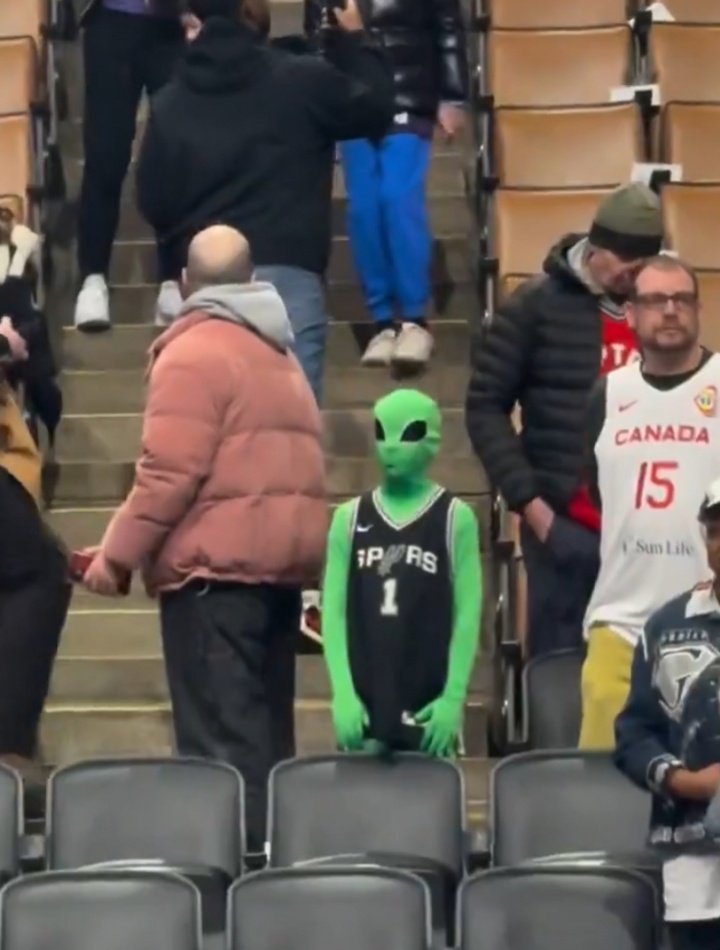 小伙子你这创意我认可了!文班的小球迷扮演成外星人来看球