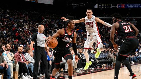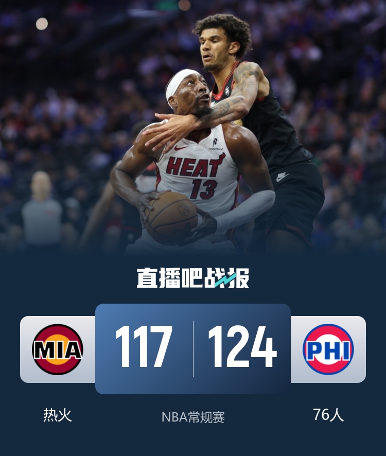 一开场,双方大打对攻,马克西外线开炮轰进5记三分超越艾弗森升至队史三分榜首,热火多点开花给出回应,次节热火命中率骤降,连续打铁失误,恩比德和埃奇库姆连续拿分帮助球队不断扩大优势,阿德巴约连得6分止血,半场战罢76人73-57领先热火。下半场,热火大举反击,连续三分命中轰出24-8的进攻高潮强势反超,76人内外开花稳住局势,末节双方争夺陷入白热化,关键时刻恩比德三分杀死比赛。最终,76人124-117力克热火,主场过关。
