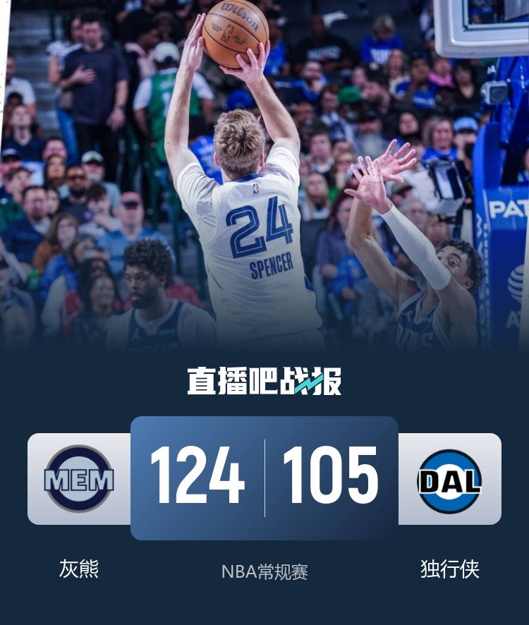 比赛开场,缺兵少将的独行侠进攻效率不高,外线连续打铁,灰熊这边则是众人发力,很快建立起领先优势,单节结束34-20领先。次节回来,灰熊延续进攻势头,独行侠这边则出现了过多失误,两队分差进一步拉大,很快来到20分以上,半场结束灰熊64-44领先。易边再战,灰熊延续攻势,普罗斯珀面对旧主连续投中,帮助球队领先到30分以上,以101-70领先进入末节。第四节上来,灰熊稳扎稳打维持优势,逐渐将胜利收入囊中,最终124-105轻取独行侠。