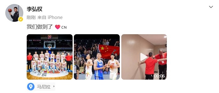 中国男篮球员李弘权赛后更新个人微博,他晒出赛场照以及赛后更衣室自己欢呼庆祝的视频,并写道:“我们做到了 ❤️🇨🇳 ”