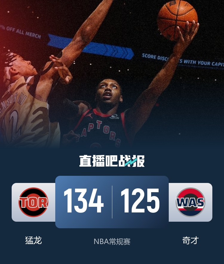 比赛开场,奇才是率先发力的一方,全队外线手感火热,单节命中7记三分,取得两位数领先优势,首节结束33-25领先。次节回来,猛龙找到进攻状态开始蚕食分差,奎克利串联球队,珀尔特尔在禁区连续打成,半场结束猛龙61-64落后。易边再战,英格拉姆在进攻端予取予求,猛龙延续攻势很快取得反超,三节结束98-92领先。末节回来,猛龙继续发力,将分差拉开到两位数,随后稳扎稳打将胜利收入囊中,最终猛龙134-125力克奇才。