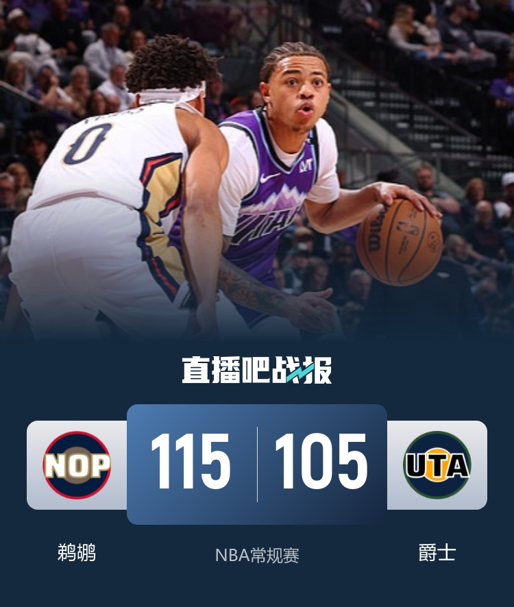 比赛上来,鹈鹕迅速进入状态打出9-0的开局取得领先,首节过去了四分多钟爵士才由贝利罚球打破僵局,他们在首节后半段一度抹平分差,但到了次节场上完全呈现出一边倒的局面,鹈鹕单节轰出38-18的比分将分差扩大到二十分以上,半场结束时爵士落后25分;下半场回来,锡安因脚踝不适提前退赛没有再打,爵士这边表现则有所回暖,分差也被缩小回二十分以内,第三节末段到末节初爵士轰出一波12-0将分差追回到个位数,紧要关头鹈鹕及时调整连拿8分稳住局势,比赛此后也没有再生波澜,最终鹈鹕再胜爵士,迎来四连胜的同时也送给后者五连败。