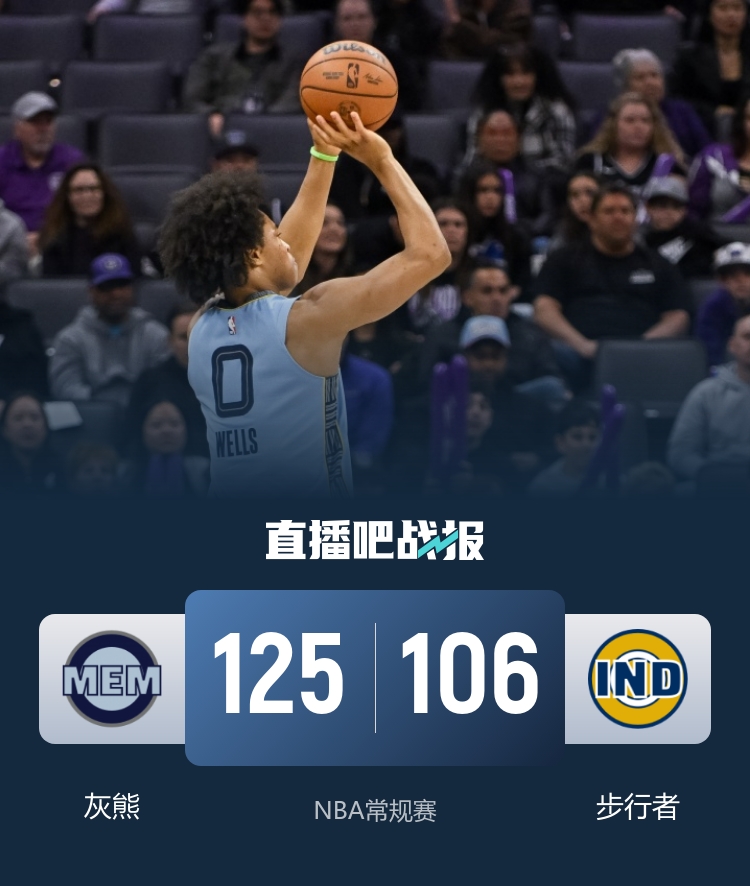 比赛开始,双方上来就展开对攻,防守端强度都不大,亨德里克斯连续三分命中,步行者全民皆兵回应,首节双方打成34平,次节步行者接连3记三分建立主动权,卡姆·斯潘塞外线连续回应,双方继续展开拉锯战,灰熊一波8-1半场领先5分。下半场,灰熊上来拉开双位数领先,步行者接连三分回应,双方继续拉锯战,三节灰熊还领先8分,末节双方继续展开拉锯战,灰熊接连3记三分领先到20分以上,最终灰熊125-106战胜步行者。