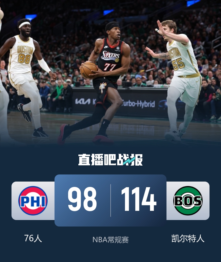 比赛开场,双方进入比赛状态都比较慢,76人这边马克西出手很多但成功率一般,凯尔特人这边则是连续在外线尝试,也是命中率不佳,首节结束76人28-26暂时领先。次节回来,马克西迟迟找不到手感,凯尔特人这边科塔在篮下予取予求,帮助球队建立优势,半场结束62-50领先。易边再战,马克西找到手感,不过布朗也是连续做出回应,分差在10分上下浮动,三节结束凯尔特人89-83领先。末节回来,凯尔特人稳扎稳打维持优势,科塔继续发力,比赛结果逐渐盖棺论定,最终凯尔特人114-98力克76人。