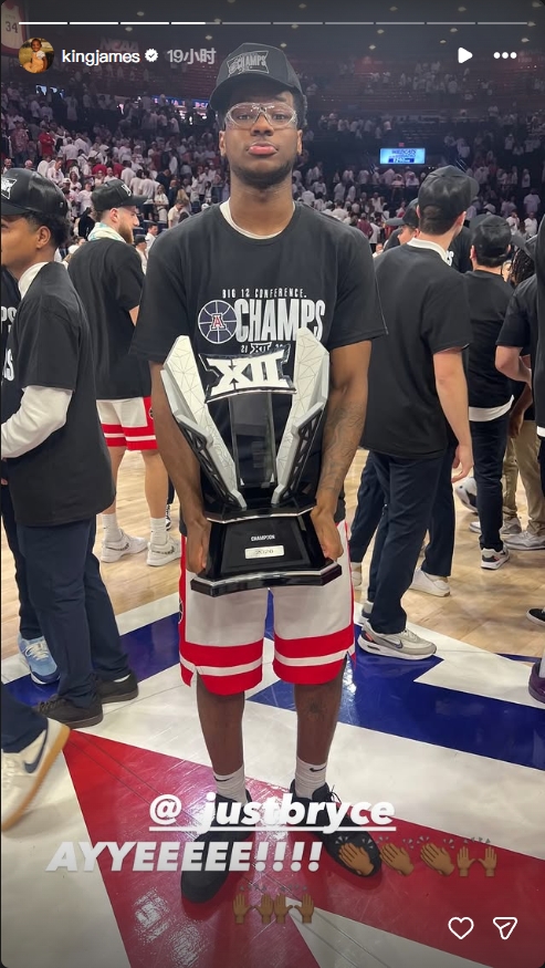 直播吧03月04日讯 湖人球星詹姆斯转发了自己的小儿子布莱斯夺得Big 12联赛常规赛冠军的捧杯图片。