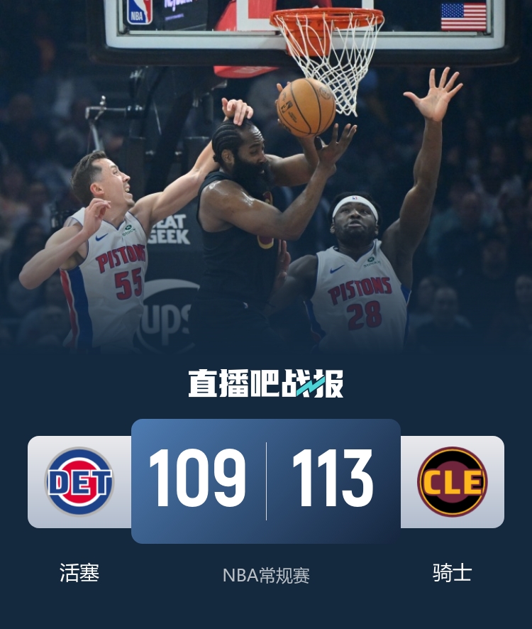 比赛开始,哈登连砍7分带领骑士打出9-2开局,活塞马上回应9-2追平,双方展开胶着拉锯战,霍兰接连三分助活塞首节领先2分,次节骑士8-0直接反超,随后骑士接连外线发炮领先到双位数,奥萨尔上篮终于破荒,哈登外线不开,半场骑士反超6分。下半场,贾勒特·阿伦受伤离场,托拜亚斯·哈里斯里突外投独揽17分带队一度追到差1分,但活塞各种失误,骑士替补连续三分再回应稳住9分领先,末节骑士重新拉开双位数领先,但哈登连续3次失误被追分,活塞一度追到差1分,梅里尔关键三分,施罗德和哈登接连关键上篮,最终骑士113-109力克活塞。