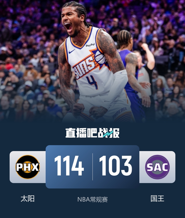 比赛上来,两队打得十分胶着,场上比分交替领先,但在蒙克上场后国王逐渐占据场上主动权,他个人4中4独得11分,次节太阳发起了凶猛的发扑,不到半节的时间轰出一波19-2的攻势完成反超,分差一度达到两位数,紧要关头威少站了出来连拿五分带队7-0止血,半场结束时太阳领先4分;下半场回来,太阳的外线火力依旧凶猛,连续的三分球命中后分差再次来到两位数,末节国王更是没有获得任何机会,分差继续扩大到二十分,最终太阳轻取国王迎来连胜。