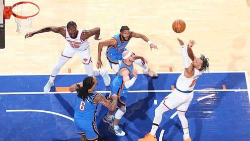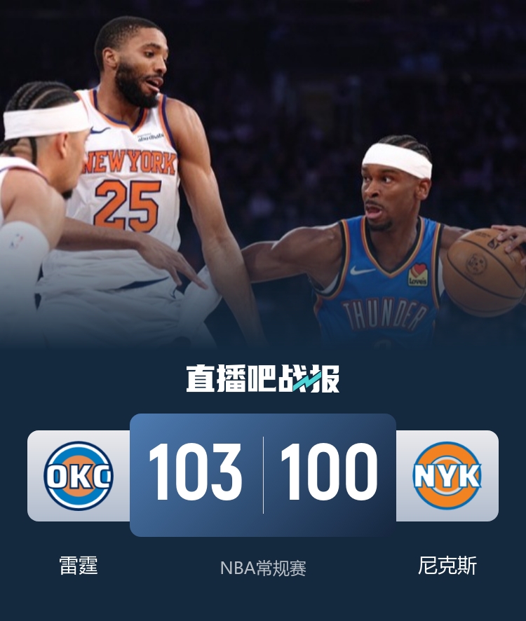 开场后亚历山大和霍姆格伦就展现出不俗手感,他们联手帮助雷霆取得领先,其中霍姆格伦三分线外手感火热,布里奇斯内突外投为尼克斯追赶比分,进入轮换阶段后尼克斯进一步缩小分差。第二节雷霆外线手感依旧火热,接连下起三分雨将分差拉大到两位数,尼克斯外线手感不佳依靠冲击内线艰难追分,半场过后雷霆领先10分。易边再战,两队陷入拉锯战,雷霆多次尝试拉开比分都被尼克斯及时咬住,第三节后半段沙梅特突然爆发帮助尼克斯抹平分差,布里奇斯在三节结束前投进三分帮助尼克斯完成反超。末节决战雷霆上来率先发力夺回领先,尼克斯依旧穷追不舍,雷霆两度关键挑战成功,唐斯和多特犯满离场。最后时刻尼克斯连续绝平三分不中,最终雷霆103-100险胜尼克斯。