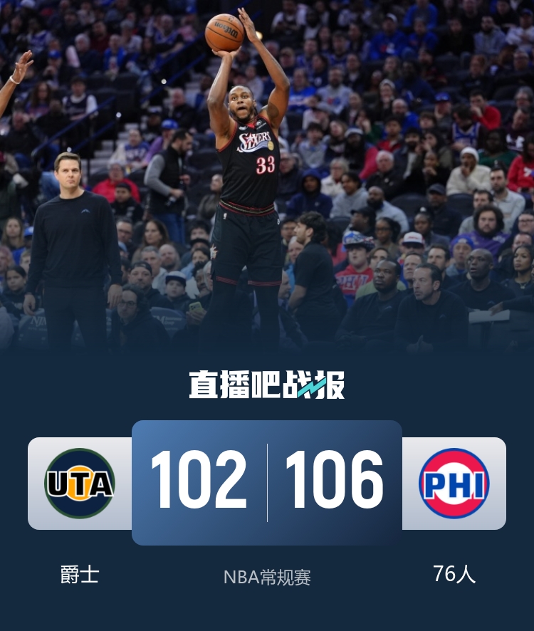 上半场,双方短暂相持,菲利波夫斯基半节就累计3次个人犯规,76人内外开花轰出15-3的攻击波取得两位数领先,此后爵士不断冲击内线连投带罚努力追赶,次节76人命中率下降,爵士稳扎稳打努力迫近比分,半场战罢76人53-48领先爵士。下半场,爵士大举反击,内外开花打出10-0的攻击波反超比分,此后双方陷入缠斗,比分交替领先,末节双方依旧打得难解难分,关键时刻爵士突然哑火,76人连投带罚反超比分,爵士绝杀失手。最终,76人106-102逆转爵士,主场过关。