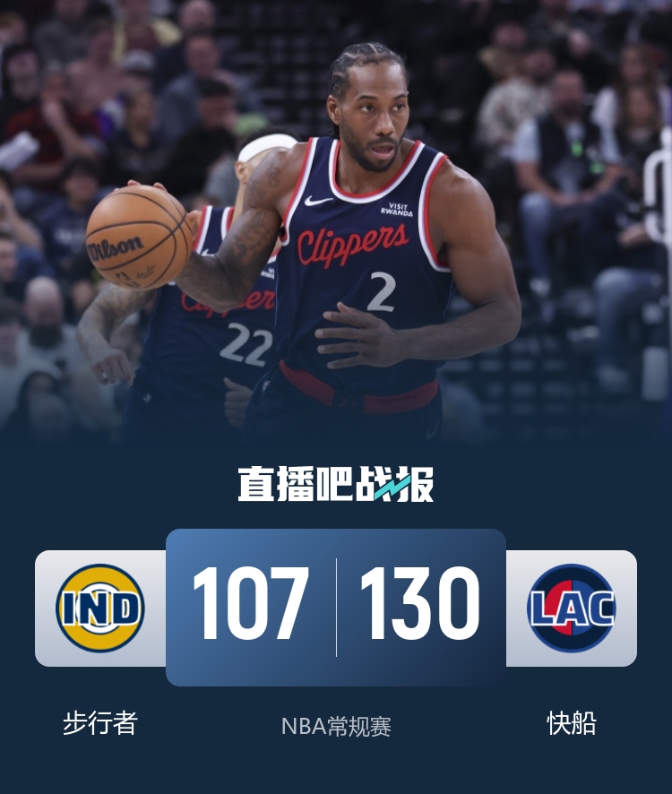 一开场,双方短暂相持,大洛连投带罚拿到5分,加兰得分助攻一肩挑,率队打出20-6的进攻高潮取得17分优势,次节伦纳德攻防两端发力带队将分差拉开到20分以上,西亚卡姆挺身而出内外开花缩小分差,半场战罢快船63-51领先步行者。下半场,快船延续火力,伦纳德和大洛相继飙中三分率队轰出27-4进攻狂潮一举将分差拉开到30分,末节胜负已失去悬念,双方尽遣轮换阵容耗完垃圾时间。最终,快船130-107大胜步行者,主场过关。