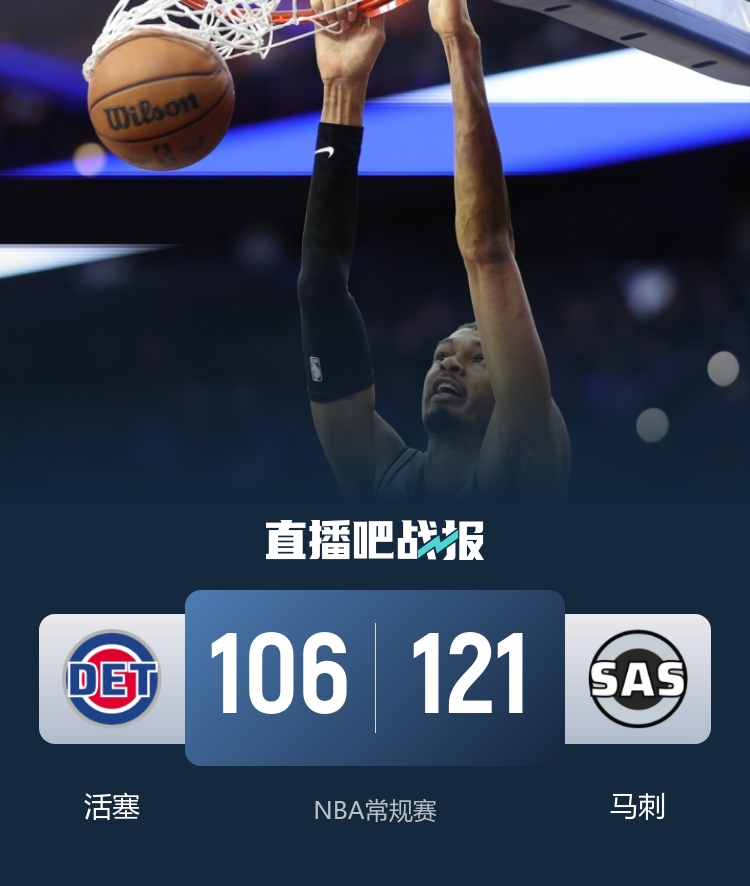 开场后文班亚马和福克斯联手帮助球队打出10-2开局,奥萨尔开场不久就受伤离场,此后活塞一度缩小分差,但文班亚马和福克斯手感太热,两人轮番砍分帮助马刺将分差拉大到两位数。第二节活塞上来就在外线找到手感吹响反击号角,马刺在文班亚马带领下毫不示弱给出回应,杜伦受到犯规困扰早早下场休息,两队陷入拉锯战,半场过后马刺依旧领先16分。易边再战,马刺上来又率先打出攻势将分差拉大到20分以上,不过活塞及时调整状态,全队整体开花又将分差重新追到个位数。末节决战,马刺再度掀起攻势将分差拉大,文班亚马攻防两端都相当活跃,此后活塞虽然努力追分但都未能再追上比分。最终马刺121-106击败活塞取得2连胜。
