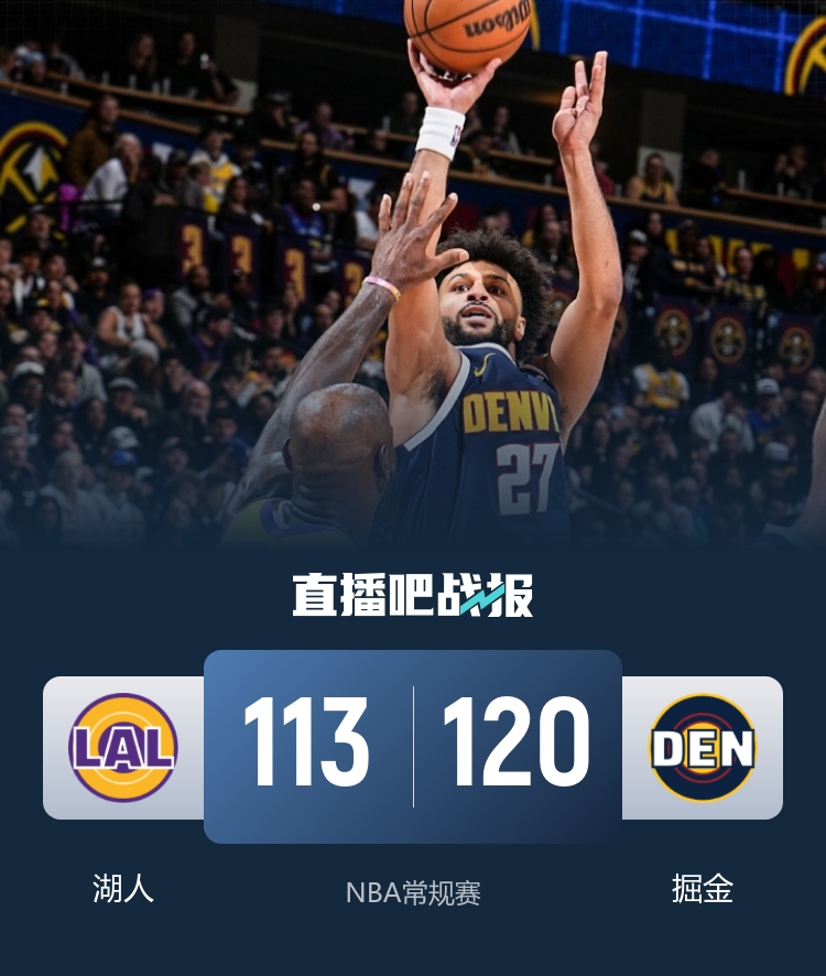 首节之争掘金手感火热上来就是一波20-9的攻势拉开比分,湖人这边则恰恰相反表现导致一直被动追分,末段詹姆斯的进球帮助自己反超贾巴尔成为历史进球最多球员;次节双方开启拉锯战分差一直在10分上下徘徊,湖人短暂追至3分但没能扭转局势,上半场穆雷砍下20分帮助掘金守住10分领先。休息归来湖人继续扮演追分角色几次迫近比分但都很难扭转局势;末节决胜掘金率先送上一波9-2的攻势拉开14分的领先,但湖人回头就送上16-6的攻势追上比分看到希望,不过决胜时刻约基奇连续打入关键球稳住领先,湖人则连续丢篮板葬送比赛。最终,掘金主场力克湖人拿下卡位战胜利。