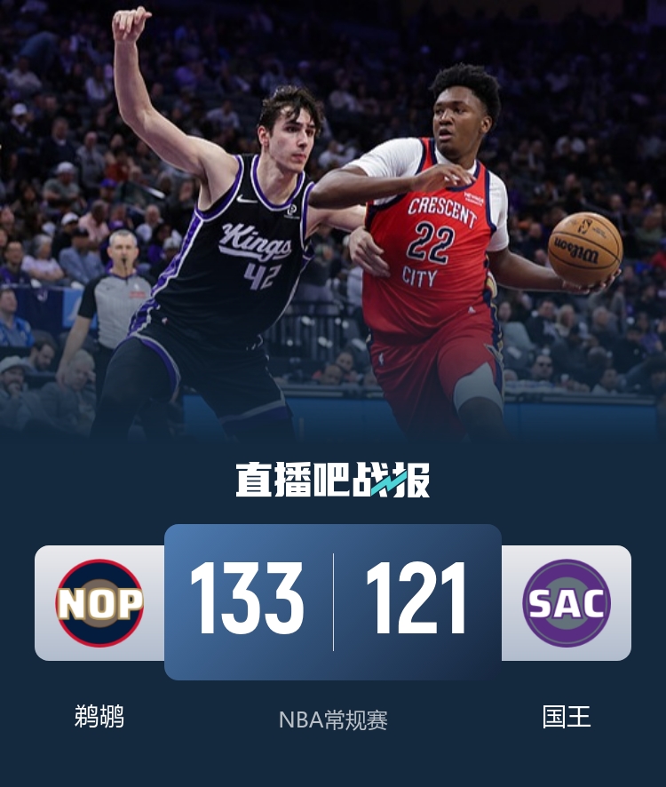 比赛上来,两队的外线表现都不好,不过德罗赞的中距离还是很稳健,靠着他的连续得分国王稍稍取得场上领先,次节双方开始展开对攻,但鹈鹕的火力显然更加凶猛,他们单节轰下41分后领先4分结束半场;下半场回来,国王的命中率下滑明显,而鹈鹕依旧攻得很凶,一波15-0的攻势将分差拉开到两位数,三节结束得分已经破百,末节国王虽然有反扑势头但始终无法获得逆转机会,最终鹈鹕力克国王,结束连败的同时也送给后者三连败。