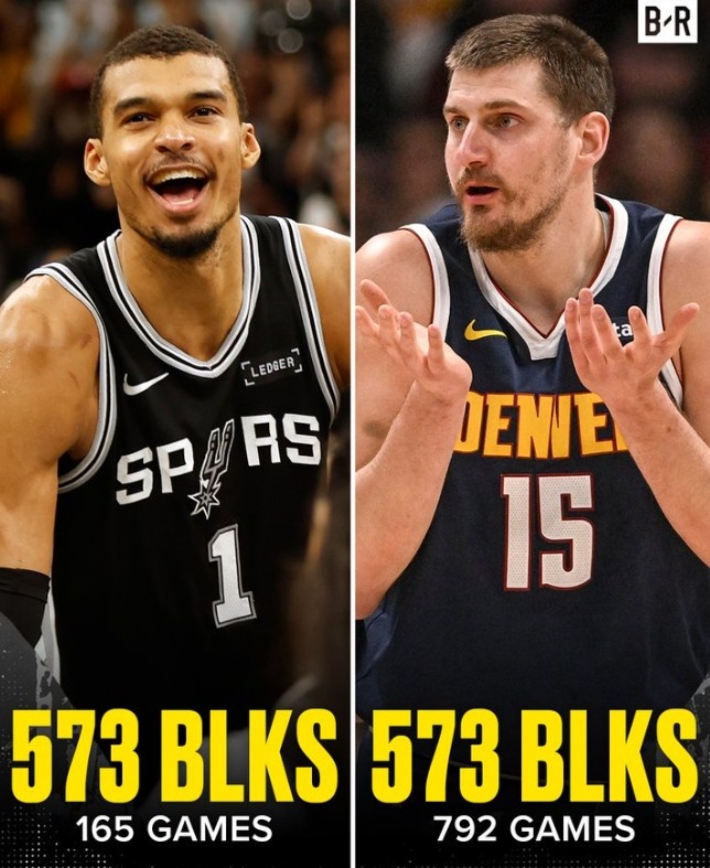 >文班亚马生涯165场比赛合计573盖帽=约基奇生涯792场比赛总和