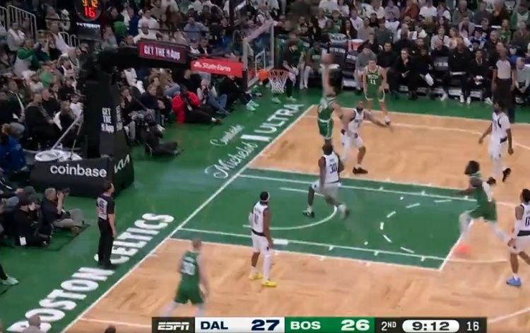 >还是不太敢发力!塔图姆中路突击 起身单臂暴扣半空篮未果