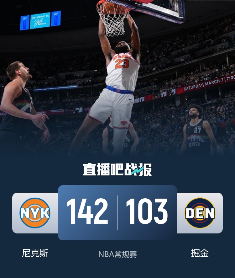 比赛开始,戈登暴扣打中回归首球,随即尼克斯叫停,约基奇表现全面,尼克斯多点开花给出回应,次节掘金命中率下降,尼克斯稳扎稳打反超比分,约基奇依靠个人能力苦苦支撑,但尼克斯越战越勇内外开花将分差拉开到两位数,穆雷崴脚伤退,半场战罢掘金52-65落后尼克斯。易边再战,约基奇延续火力,连投带罚拿到9分苦苦支撑,但尼克斯持续发力内外开花牢牢占据场上主动,掘金后劲不足,尼克斯越战越勇不断扩大领先。最终,尼克斯142-103大胜掘金。客场过关。