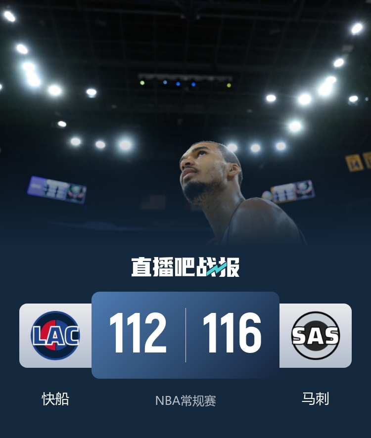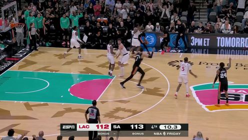比赛上来,琼斯率先命中三分球后马刺打了一波9-0的小高潮,不过快船很快就追了回来,文班亚马在首节后半段突然返回更衣室,好在是虚惊一场继续打,次节马刺的失误开始增多,快船抓住机会连续打反击将分差拉开到两位数,半场结束时马刺已经落后20分;下半场回来,马刺发起了凶猛的反扑,其中尚帕尼单节轰进5记三分球独得20分,到了末节马刺又打一波13-0的攻势直接完成反超,比赛悬念重生,关键时刻小琼斯强打文班亚马2+1领先,但后者随后就扣篮再超出,快船出现离谱发球失误,马刺率先暂停避免了瓦塞尔的进攻犯规,尚帕尼两罚不中好在自己抢到篮板,卡斯尔两罚中一后又是自己补篮杀死比赛,最终马刺25分逆转快船迎来三连胜。