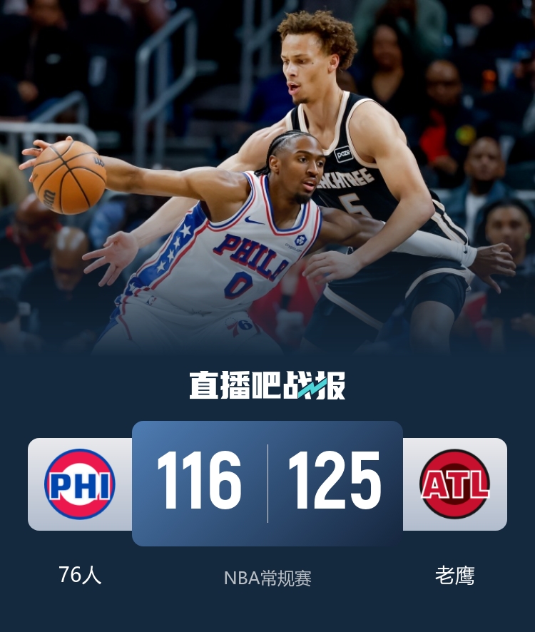 比赛开始,双方上来首发五虎都迅速进入状态展开对攻战,随后老鹰突然断电,马克西和乌布雷带队打出小高潮建立双位数领先,次节76人连续反击扩大领先,但老鹰始终能止血回应,杰伦·约翰逊和麦科勒姆联手11-1一度追到差1分,马克西三分止血,76人半场还领先7分。下半场,老鹰上来10-2小高潮反超,乌布雷和格莱姆斯接连突破止血,双方拉锯比分多次打平,三节老鹰反超3分,末节双方继续拉锯战,比分始终拉不开,老鹰连续三分8-0一度领先双位数,76人连续三分止血,但杰伦·约翰逊连续暴扣还能回应,最终老鹰125-116逆转76人。