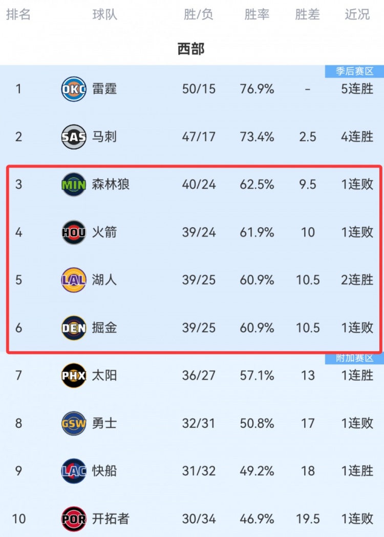 至此,西部排名如下图所示,排名第3-6的森林狼、火箭、湖人、掘金最多只差1个胜场。