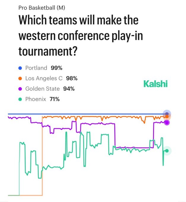 直播吧3月9日讯 预测平台Kalshi Sports晒出了本赛季西部附加赛概率预测,概率达到70%+的球队如下: