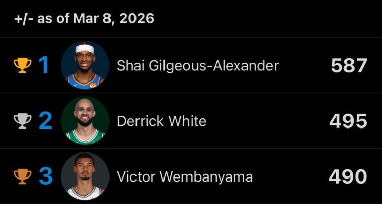 本赛季正负值前三:亚历山大+587、怀特+495、文班+490