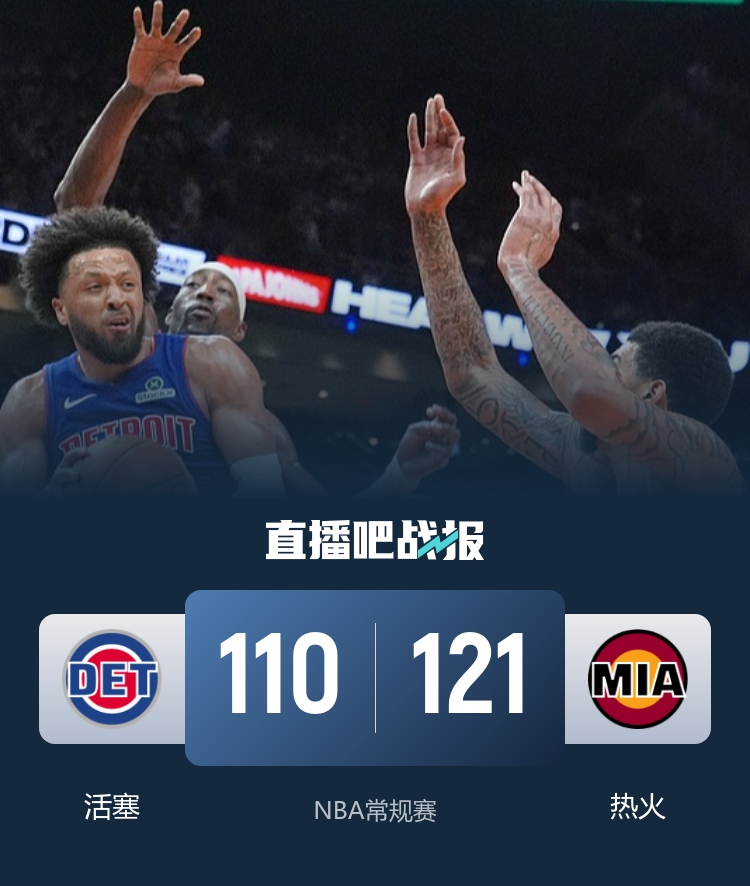 比赛开始,热火上来捍卫主场打出13-2开局,坎宁安里突外投加助攻带队止血,但热火全民皆兵给出回应并扩大领先,首节热火领先到18分,次节活塞10-2后热火回应9-0,随后希罗连得8分带队又是一波11-0领先到20分以上,坎宁安攻传带队止血。下半场,热火接连外线三分重新拉开比分,随后活塞再追至20分以内分差,但希罗连续3记三分又拉开27分领先,末节热火又是8-2拉开近30分领先,活塞追分无望,随后双方练兵,最终热火121-110轻取活塞。