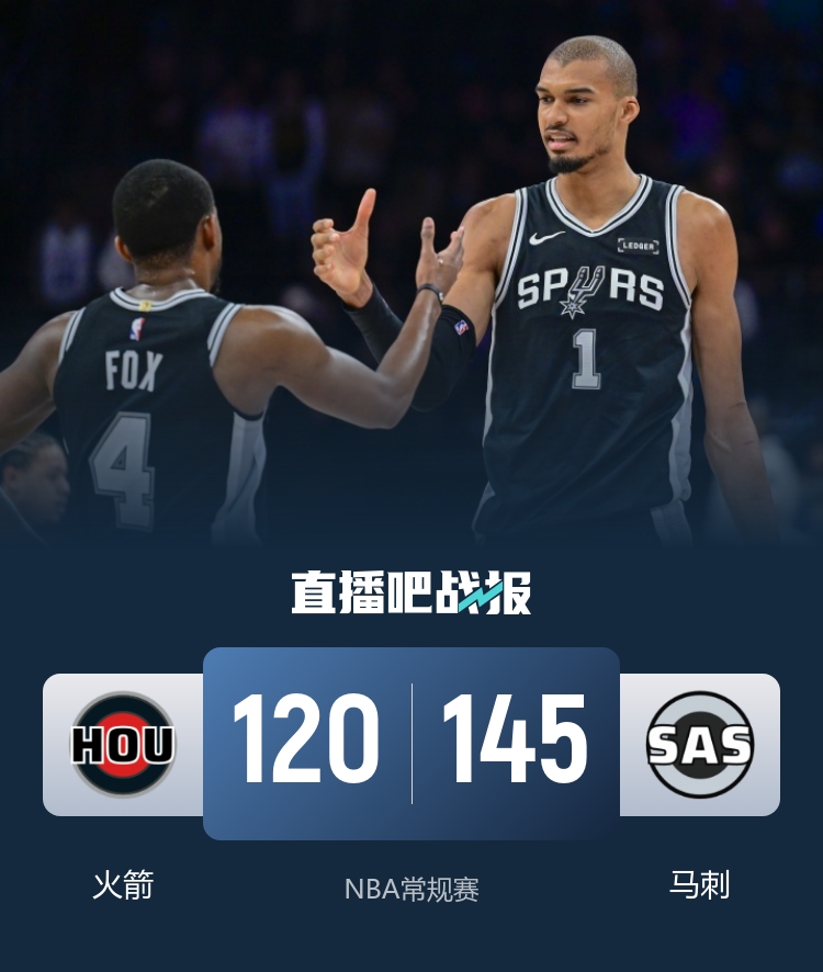 马刺(47-17):文班亚马29分8板1助2断4帽、卡斯尔23分3板5助、福克斯20分2板10助、凯尔登20分1板2助、哈珀19分2板6助、尚帕尼11分5板4助2断、布莱恩特7分3板、瓦塞尔5分5板3助、麦克劳林3分1板1助、沃特斯3分2助、奥利尼克3分1助、科内特2分1板3助、比永博1板。