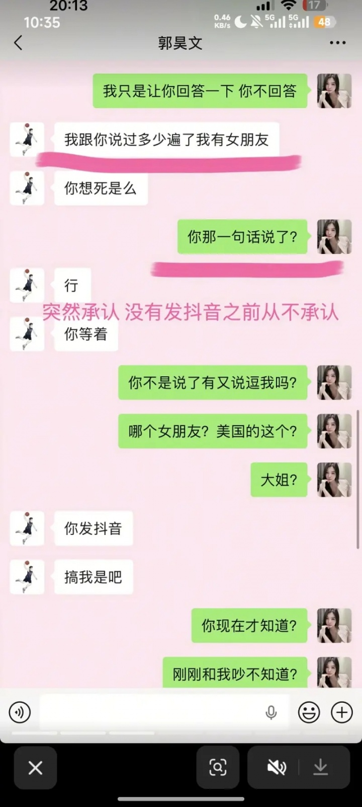 ZW晒聊天记录,控诉郭昊文在外宣称是ZW自愿做小三;