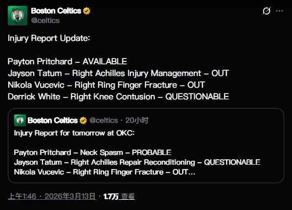 绿军官方更新本场比赛的伤病报告,其中塔图姆因右跟腱伤病恢复管理将缺席本场比赛。