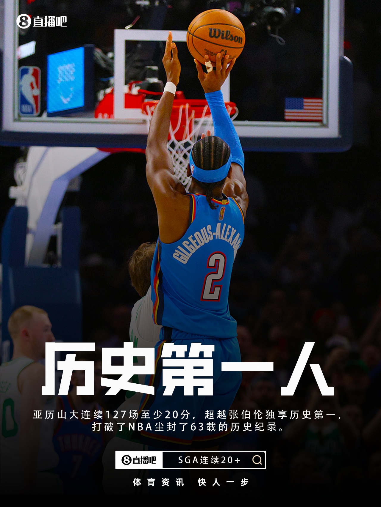 这样,亚历山大连续127场至少20分,正式超越1961-63赛季的张伯伦(126场),登顶NBA历史第一。