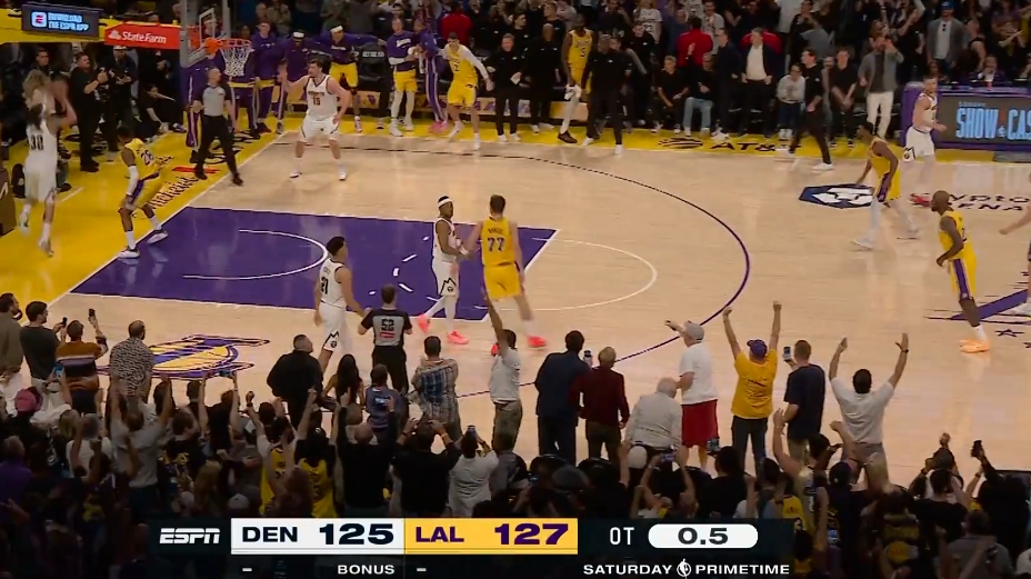在约基奇2分追平后,东契奇撤步跳投绝杀,掘金0.5秒反绝杀不中,湖人拒绝17分大逆转。