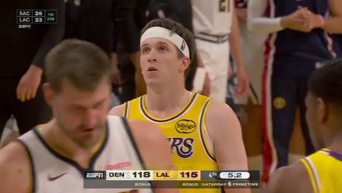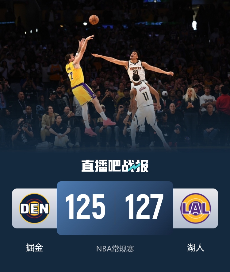 比赛开始,湖人外线开火飙中5记三分,约基奇得分助攻一肩挑带队回应,东契奇和里夫斯联手拿分率队将分差拉开到两位数,次节湖人越战越勇,詹姆斯持续发力带队扩大领先,穆雷手感冰凉,约基奇连投带罚苦苦支撑,半场战罢湖人61-50领先掘金。易边再战,斯玛特三分先声夺人,掘金多点开花努力追赶,湖人稳扎稳打保持优势,东契奇打进加罚被掘金挑战取消,随后约基奇3+1引领球队攻击波不断蚕食分差,布鲁斯·布朗连得5分,双方三节打完重回同一起跑线。末节决战,掘金外线开炮,不断三分命中逐渐占据场上主动,关键时刻阿隆·戈登连续三分命中,东契奇连得6分抹平分差,詹姆斯鱼跃扑抢,斯玛特抢断反击得手,决胜时刻约基奇助攻小哈达威三分命中,随后切球小里夫斯,戈登两罚中一,里夫斯自罚自抢连得3分完成绝平,将比赛拖入加时。加时赛,穆雷6犯离场,艾顿独中2球,阿隆·戈登和斯玛特对飙三分,东契奇完成准绝杀,最终湖人加时127-125加时力克掘金,豪取5连胜。