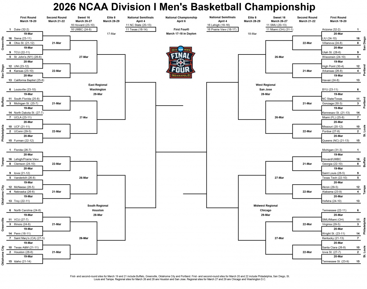 直播吧03月16日讯 一年一度的篮球盛宴拉开帷幕,2026年NCAA疯狂三月68强(64+4个外卡)对阵表正式出炉,小布泽尔、迪班萨、彼得森等热门球员将悉数亮相。。