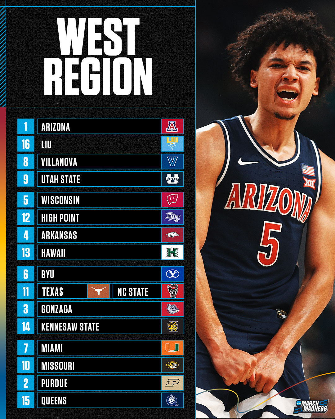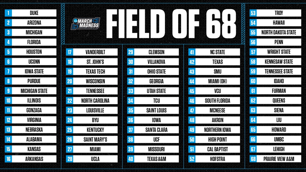 杜克大学总实力排名第一,亚利桑那大学、杜克大学、密歇根大学、佛罗里达大学分列四大赛区一号种子。