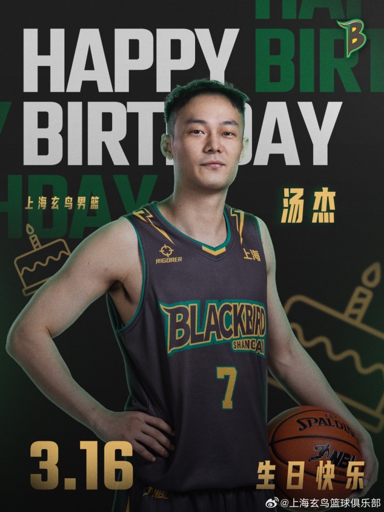 直播吧3月16日讯 NBL球队上海玄鸟篮球俱乐部发文,祝福队内球员汤杰27岁生日快乐。