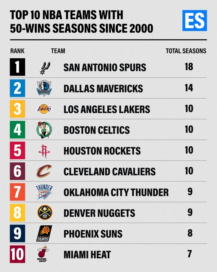 2000年至今球队50胜次数排名!马刺18次最多 湖人绿军火箭均10次