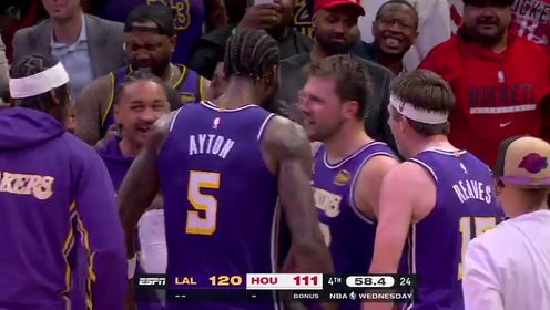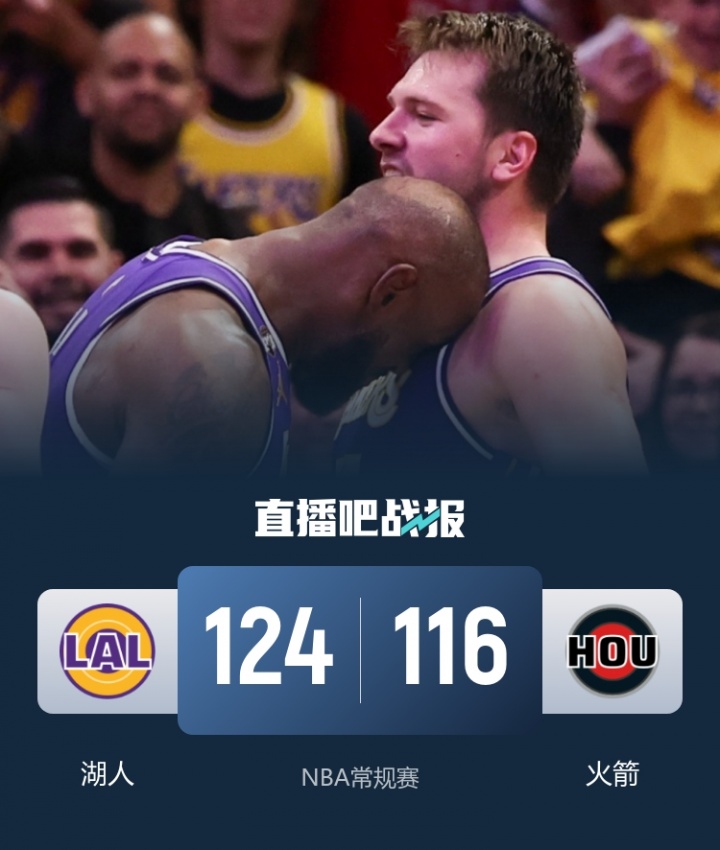 比赛开始,双方开场势均力敌,比分咬得很紧,东契奇火力全开,里突外投连续拿分,杜兰特又有2次失误,湖人打出11-2的攻击波确立优势,次节詹姆斯连续暴扣将分差拉开到两位数,火箭全民皆兵苦苦支撑,东契奇延续火力扩大领先,半场战罢湖人67-55领先火箭。易边再战,湖人突然哑火,火箭轰出20-5强势反超,詹姆斯扣篮2+1稳住局势,申京和杜兰特联手拿分,末节詹姆斯得分助攻一肩挑带队打出11-4夺回优势,火箭9-0迅速回应,双方争夺陷入白热化。关键时刻,东契奇连中三分,并先后助攻八村塁和詹姆斯暴扣,率队打出攻击波杀死比赛。最终,湖人124-116再胜火箭,豪取7连胜。