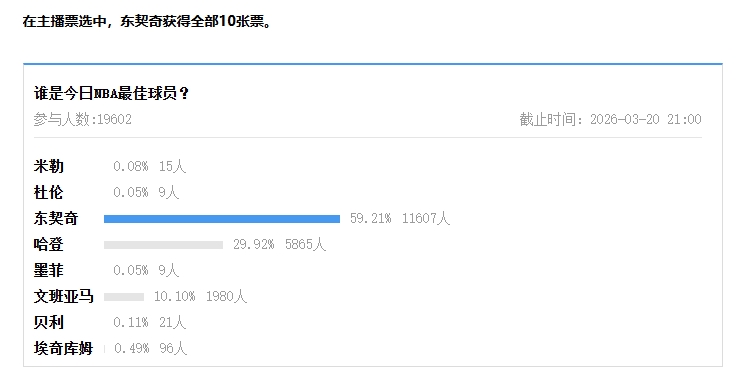在主播票选中,东契奇获得全部10张票。
