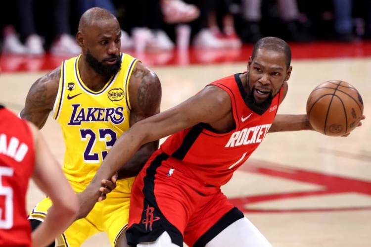 当你看到火箭频频让杜兰特运球过半场处理激进夹击的画面——这在杜兰特年轻的时候也不是正确的使用方式——就愈发觉得勒布朗在湖人做的事情,才是一把年纪的老家伙正确的比赛姿势啊!